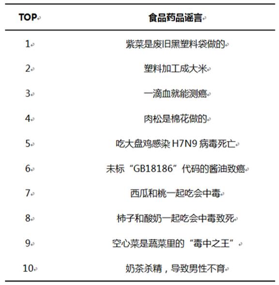 报告显示“紫菜是废旧黑塑料袋做的”高居谣言榜榜首,“塑料加工成大米”、“一滴血就能测癌症”紧随其后位居第二、三位。