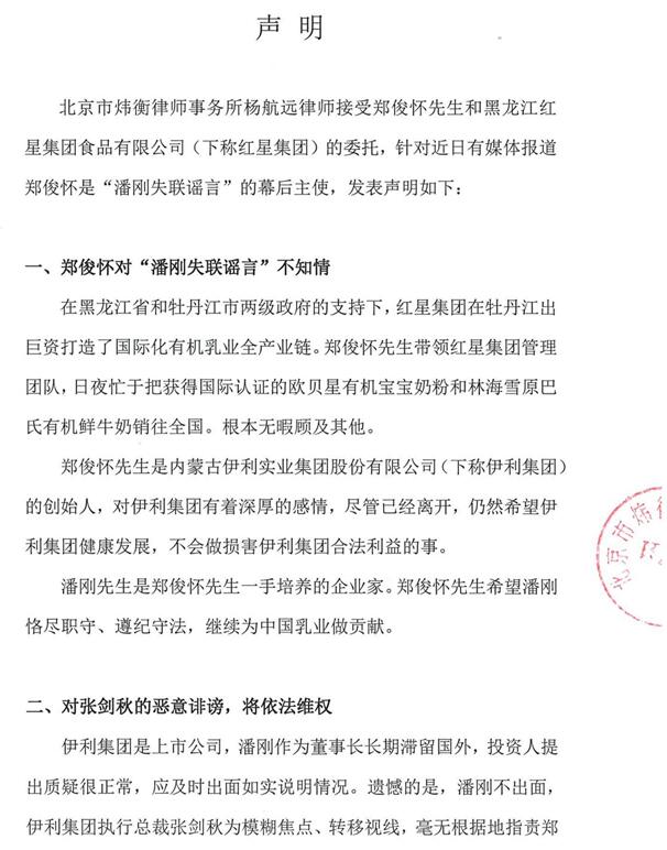 近日有媒体报道称伊利前董事长郑俊怀是“潘刚失联谣言”的幕后主使,就此事郑俊怀和红星集团于4月9日委托北京市炜衡律师事务所杨航远律师发表声明称,郑俊怀正在带领红星集团管理团队,忙于把红星产品销往全国,根本无暇顾及其他。
