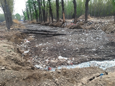 4月13日,通州北堤寺村,养猪场院后水沟的一段水体,已被养猪场倾倒的粪便和污水覆盖凝固。