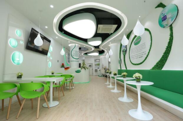 澳亚体验店的室内以白色和绿色为主色调,白色象征牛奶,绿色象征天然。整个空间多用流线设计手法,如奶滴形状的氛围灯,不规则曲线吊顶,圆柱,弧线椅等,虽然空间色调偏性冷淡,但流线的设计亲切温暖,与牛奶的丝滑相得益彰,更突显高品质、高品味、高追求的品牌个性。