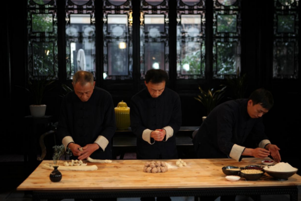 稻香村制作技艺传承人:第四代徐全生(左)第五代徐红生(中)第六代艾满(右)