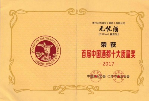 通过几十年的努力,无忧酒建立起了完整的质量保障体系和产品质量企业内控标准(高于国家标准),产品先后通过了四大质量管理体系认证。在2017年参评遵义十大名酒评比,“无忧”酒质量受到专家们的高度肯定,荣获中国酒业协会和仁怀市酒业协会联合授予的“中国酒都十大质量奖”(排名第一)的殊荣。
