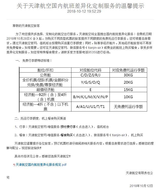 10月12日,天津航空官网发布《关于天津航空国内航班差异化定制服务的温馨提示》,称这次调整是为了向旅客“提供多选择、定制化的航空出行服务”。