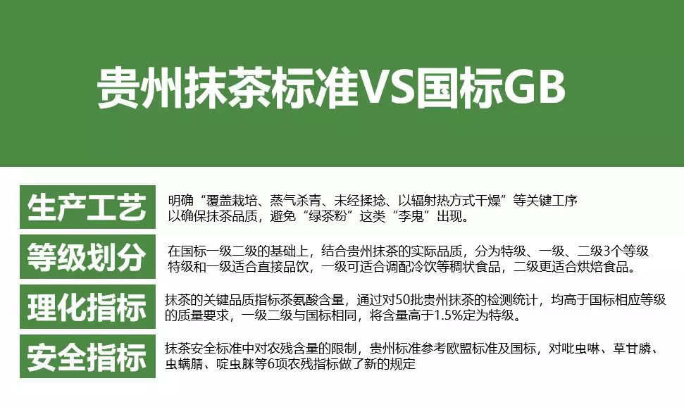 据悉,今年5月GB/T 34778-2017《抹茶》新国标正式实施,对抹茶的术语、定义、要求、试验方法、检验规则、标志、标签、包装、运输与贮存等都做出了规定。然而,国标提供的仅仅是基础标准,在抹茶生产企业内部依旧还有等级分类。贵州标准,则是补充和升级,代表中国可以做出高品质的抹茶。