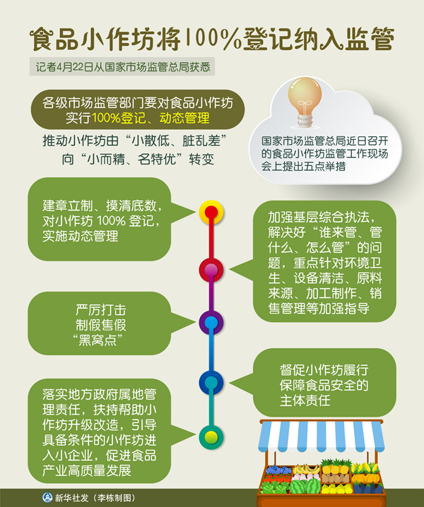 记者22日从国家市场监管总局获悉,各级市场监管部门要对食品小作坊实行100%登记、动态管理,推动小作坊由“小散低、脏乱差”向“小而精、名特优”转变。