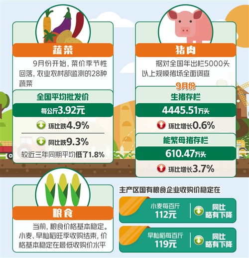 粮食是最重要的农产品,粮价是百价之基。唐珂说,今年夏粮增产,秋粮大部分长势良好,如后期不发生大的自然灾害,又将迎来一个丰收年。当前,粮食价格基本稳定。小麦、早籼稻旺季收购结束,价格基本稳定在最低收购价水平,主产区国有粮食企业收购价稳定在每百斤112元和119元左右,同比略有下降。截至9月30日,主产区各类粮食企业累计收购小麦7076.2万吨,同比增加41%;累计收购早籼稻599.9万吨,同比减少23%。部分地区早熟玉米开始上市,价格有所下跌,但仍高于上年同期,总体属于正常季节波动,玉米市场价格短期下跌后将逐步企稳。