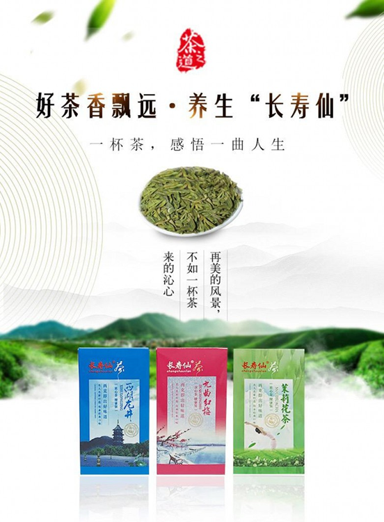 好茶香飘远,养生长寿仙。“长寿仙”茶,是杭州爱我食品有限公司推出的茶业品牌。毎一包从生产端到消费端,都倾注了“匠心、诚信、独到、好礼”。在匠心上,讲究在传承传统工艺的基础上,优化工艺路线,以不涩、鲜香、清纯、甘甜为己任,做一款有温度的茶;在诚心上,采用防紫外线的保鲜包装,使产品更加安全、便捷、时尚,每一口都是慢慢的放心;在独到上,体现了优中选优,两克即出好味道;在好礼上,“长寿仙”茶传递了中国茶文化中豁达的心境,传递了一种快乐轻松的生活方式。促进新陈代谢,延缓衰老。“长寿仙”茶,爱意浓浓,祝福好。希望把东方茗茶汇打造成中国乃至世界级的茶叶平台。