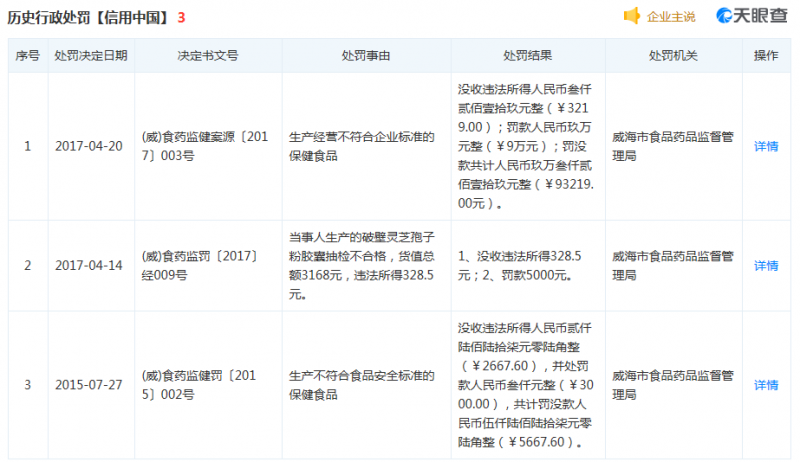 2017年4月20日,因生产经营不符合企业标准的保健食品,遭威海市食品药品监督管理局行政处罚,共罚没93219元。