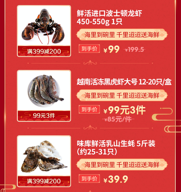 一桌完整的年夜饭,一定少不了各类海鲜。而海鲜不仅美味,还有一个好彩头,比如过年吃生蚝,来年比较“豪”,过年吃龙虾,大家一起发!在京东年货节上,鲜活进口的波士顿龙虾,一只450-550g,京东价要199.5元,年货节到手价低至99元,而且满399减200;越南活冻大号黑虎虾,一盒12-20只,京东价 85元一件,年货节期间99元能拿走三件。