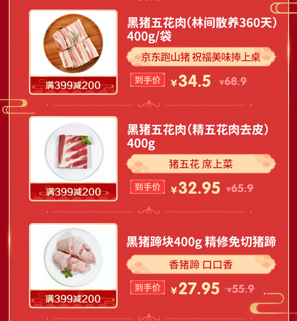 在中国家庭的饭桌上,鸡肉、鱼肉和猪肉向来是最常见的菜品,这些可口“硬菜”足以撑起年夜饭的“半边天”。在国内,林间鸡和黑猪肉是人们最乐意购买的高品质肉类食品,现在来京东年货节,京东价128元3斤重林间散养菜鸡,直降20元,108元到手,并且买一只送一只,无比划算。400g袋装京东林间散养跑山黑猪五花肉京东价68.9元,到手价仅为34块5,而且享受满300减200的优惠。