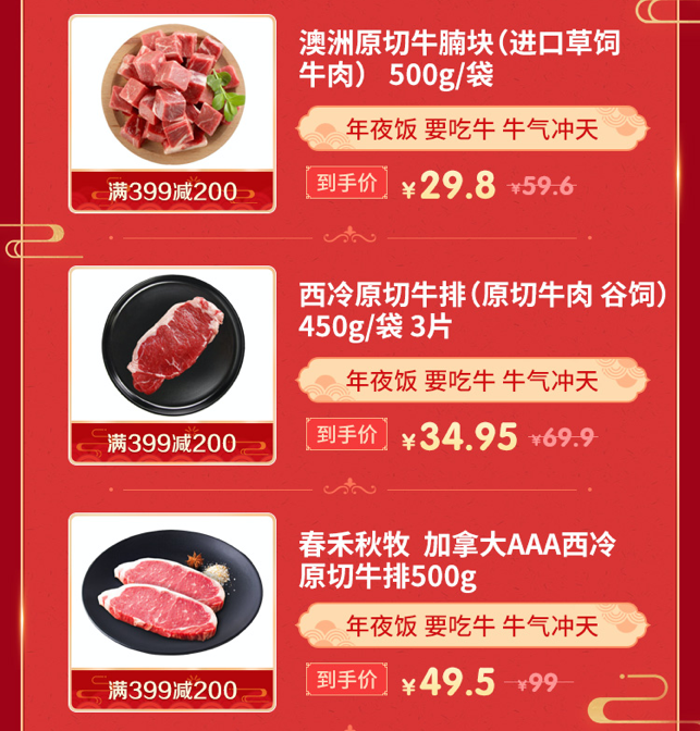 国外牛肉,澳洲进口草饲牛肉原切牛腩块1斤装,京东年货节到手价只要29块8;西冷原切牛排3片袋装450g,京东价69.9元,到手价更只要34.95元;还有春禾秋牧加拿大AAA西冷原切牛排一斤装,年货节到手为49.5元,以上三种牛肉还都享受满399减200钜惠,相当超值了!