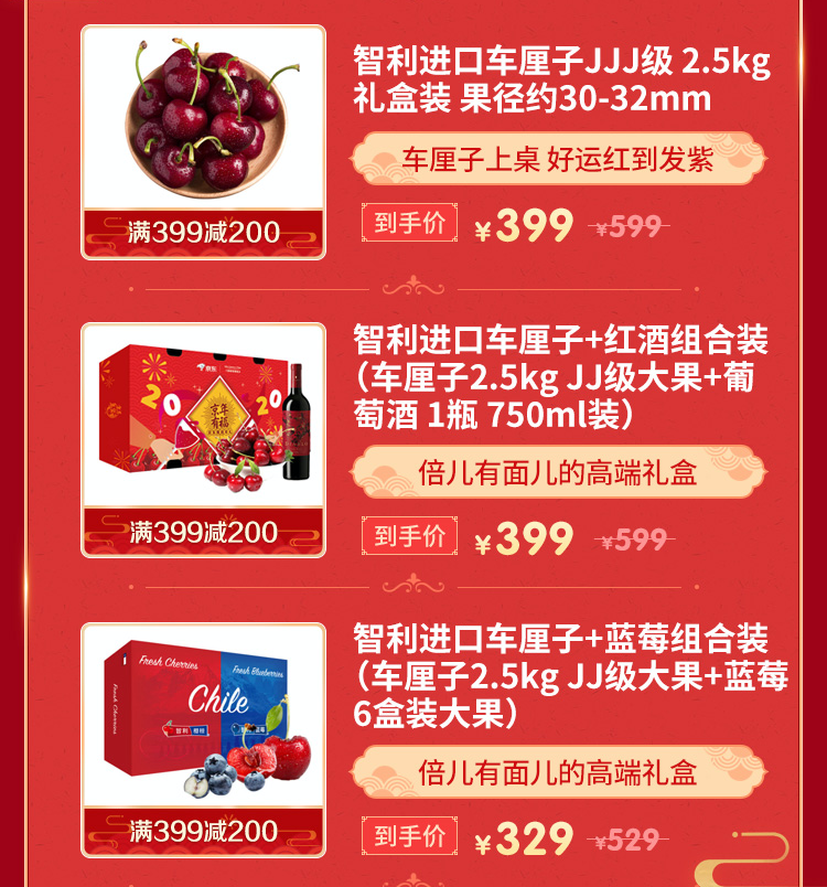 此外,智利进口车厘子JJJ级5斤礼盒装和750ml红酒组合装价格仅为399元;5斤装的智利进口车厘子JJ级大果与6盒蓝莓的组合装更是329元拿到手,高端礼盒的配置,消费者买来无论自食待客,还是送礼,都是倍儿有面子!