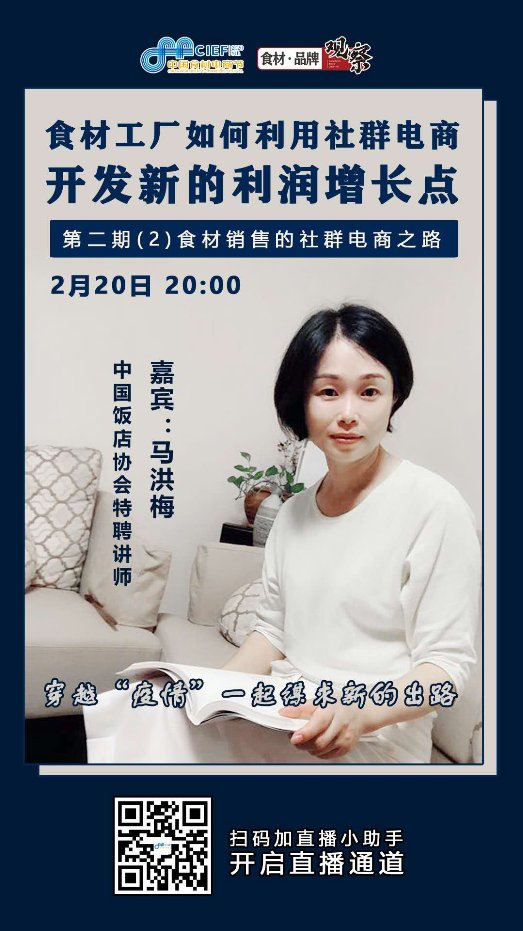 这一期,我们特邀了中国饭店协会马洪梅老师,以“食材工厂如何利用社群电商开发新的利润增长点”为主题进行直播,共同探讨了疫情之下,食材、餐饮企业应该怎样创造新的利润增长点。如何以“社群电商”为纽带,帮助需求端解决供应端。