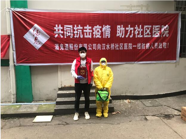 3月6日,酒鬼酒公司捐赠了价值近12万元的生活物资,定向关怀与慰问武汉硚口区汉水桥社区医院在一线防疫的医务人员,以表达崇高敬意。疫情发生以来,酒鬼酒公司员工李杰定点在汉水桥社区医院做志愿者。