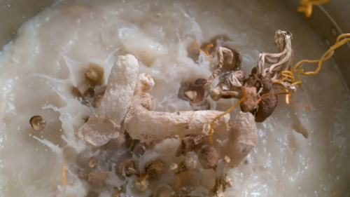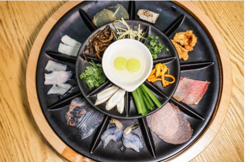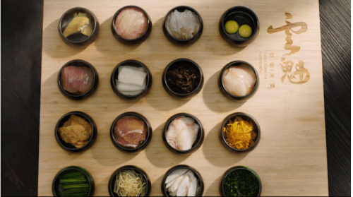 过桥米线的食用过程充满着仪式感,将一碗看似寻常的米线 吃的更有仪式感,足以慰藉生活中交织的疲惫。一碗以高原雪山 涌泉水、高山生态土猪土鸡熬制的云魁经典好汤煮沸上桌,汤体 貌似波澜不惊却内里滚烫,夹起配盘里的里脊肉、诺邓火腿、香 酥、草芽、鹌鹑蛋、油鸡枞等十余种精致食材,依次放入汤中, 瞬间煮熟,味香交融。