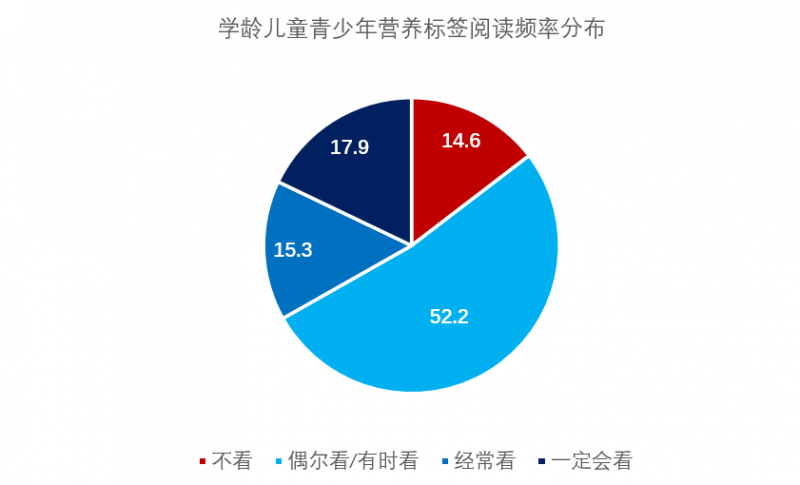 本次调查结果显示,学龄儿童和青少年营养标签阅读率较高,达到85.4%,其中4-6年级小学生为83.6%,初中生为87.1%,高中生为86.2%。阅读频率以偶尔看/有时看的频率最高,占比达到52.2%,一定会看的频率占比达到17.9%。