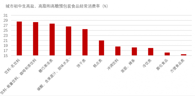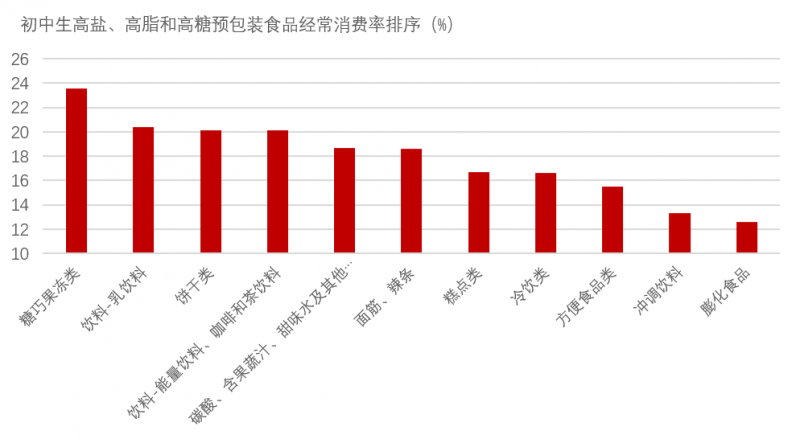 初中生群体糖巧果冻类和含糖饮料类预包装食品经常消费率较高