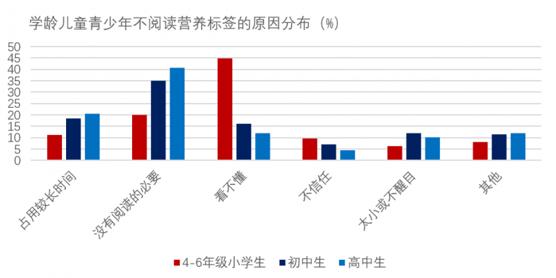 学龄儿童和青少年不阅读营养标签的原因分布从高到低为:认为没有阅读的必要、看不懂、占用较长时间、太小或不醒目、不信任。其中小学生不阅读营养标签的主要原因为是看不懂和认为没有阅读的必要,初中生和高中生不阅读营养标签的主要原因为是没有阅读的必要和占用较长时间。
