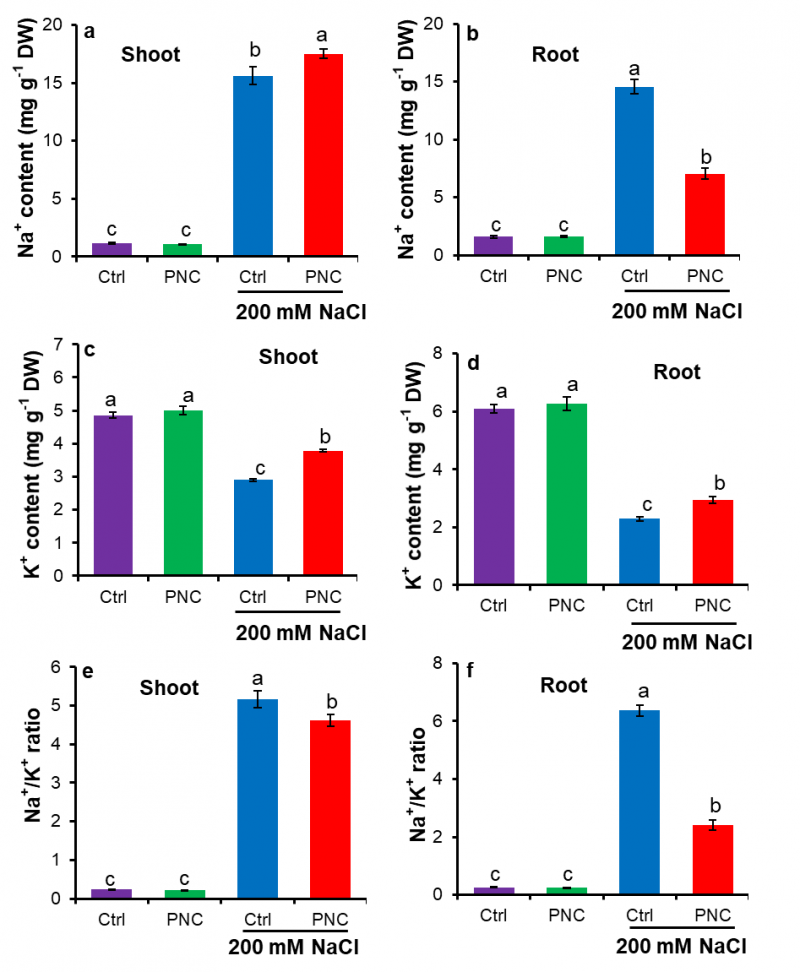 Our results suggested that besides the more absorbed water and higher α-amylase activities, PNC nanopriming improves salt tolerance in rapeseeds through alleviating oxidative damage and maintaining Na+/K+ ratio. It adds more knowledge regarding the mechanisms underlying nanopriming improved plant salt tolerance.