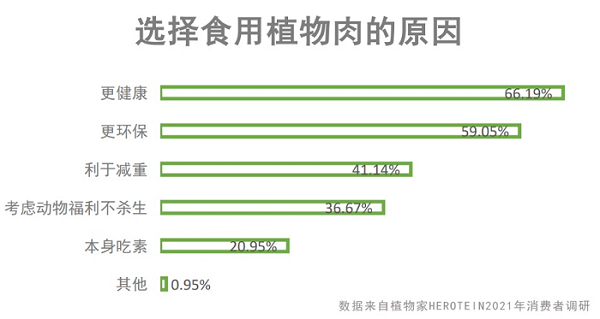 越来越多的消费者开始选择新型的植物肉产品,植物家的消费者调研显示(复选):66.19%的受访者是由于植物肉更健康而选择食用,其次是出于环保观念(59.05%),再次是看中植物肉利于减重的优势(47.14%),而考虑到不杀生、动物福利而选择的消费者则占36.67%。