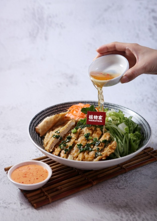 植物家与越南餐厅河仙合作推出的植物素鸡排檬粉