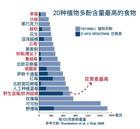 地球植物中含有植物多酚最多的食物是浆果一族,而浆果中花青素含量最高的就是北欧野生蓝莓(学名:欧洲越橘),其含量是其他品种蓝莓的5倍,也被称生物利用度最高的天然滋补品。适合所有年龄,无食用风险。