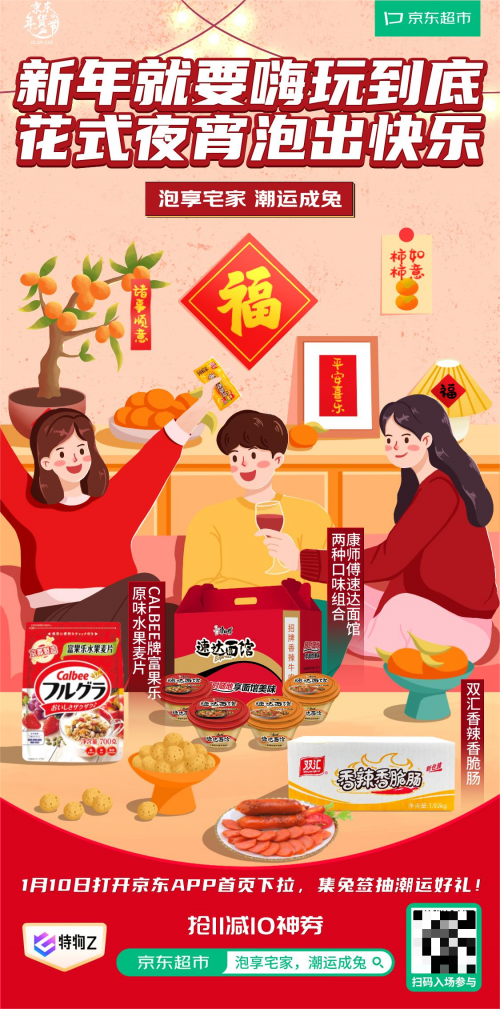 京东超市X特物Z,联合康师傅、雀巢奶粉、桂格、五谷磨房、飞鹤、银鹭等知名品牌,于1月4日和1月10日分别上线以“新潮宅礼,惊喜成兔”,“泡享宅家,潮运成兔”为主题的年货会场。活动力度大,福利众多,满满诚意。在1月10日打开京东APP首页,新年来拉,集兔签抽新潮好礼,更有11减10神券等你抢。无论这个春节你身处何地,上京东超市都能让你感受到暖暖的温馨、浓浓的年味儿。