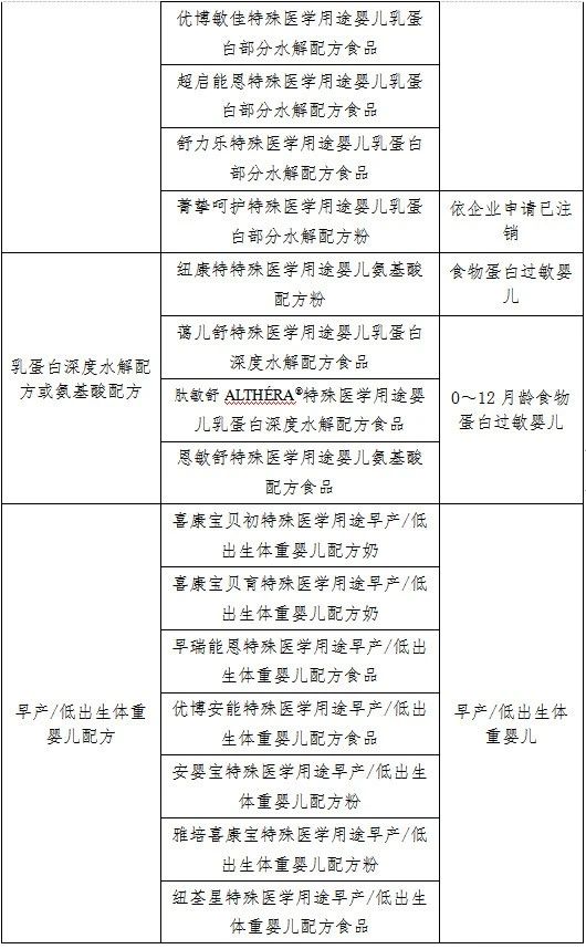 截至2023年2月,国家市场监督管理总局共批准40个特殊医学用途婴儿配方食品,其中2款产品依企业申请已注销。产品类别、产品名称及对应的适用人群情况见下表。