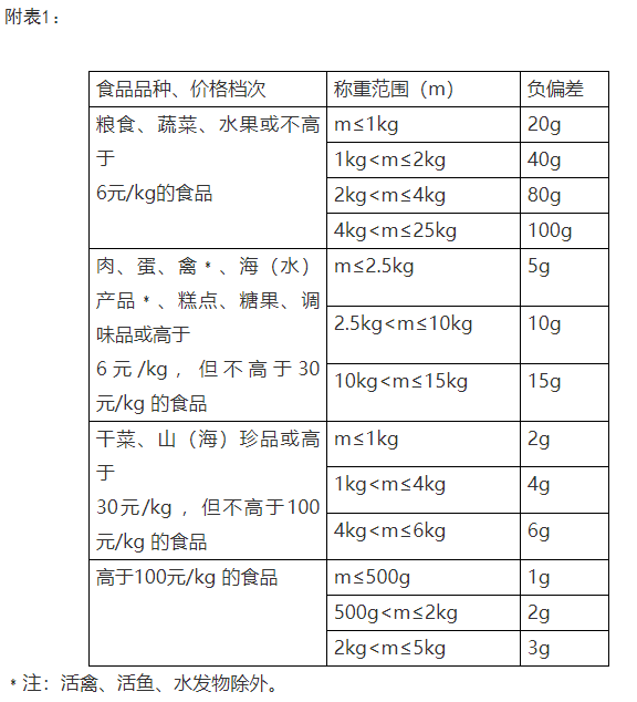 零售商品经销者使用称重计量器具每次当场称重商品,在本办法附表1、附表2称重范围内,经核称商品的实际重量值与结算重量值之差不得超过该表规定的负偏差。