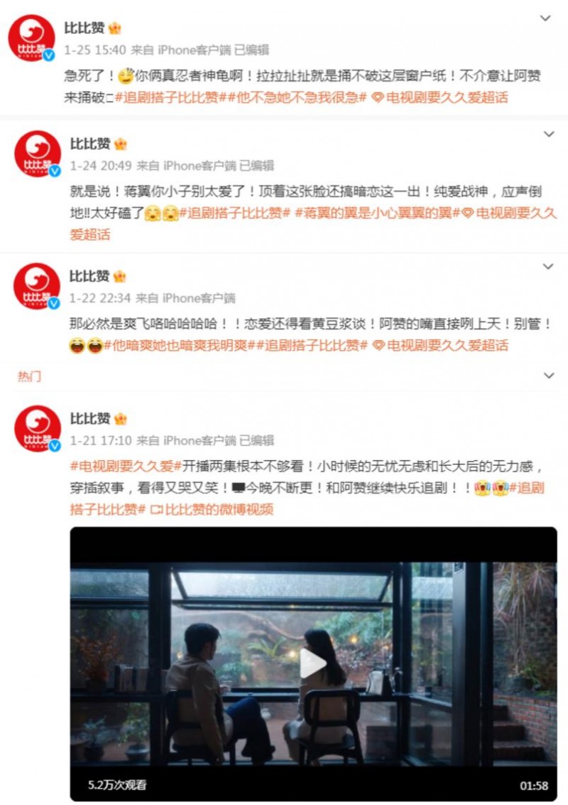 互联网时代下,品牌利用传统营销方式怒刷存在感的意义不大,与影视剧的重合受众在新兴媒体渠道打成一片,或许能高效提升品牌形象和认知度。在电视剧《要久久爱》的热播期间,【比比赞】利用微博完成高效传播,引爆网络热点话题,在互动中渗透品牌价值。