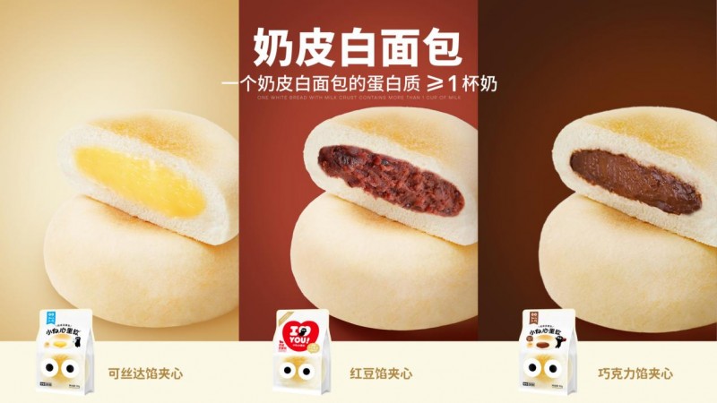 小白心里软向我们透露,今年品牌主推大单品仍是奶皮白面包系列。这是一款主打代餐场景的圆面包,拥有烘烤后形成的奶皮般Q弹外皮和比肩一杯牛奶的蛋白质含量。包装上是小白标志性的大眼睛标志,柔软的面包体里有不同的夹心,外层为烘烤形成的“奶皮”,表面撒有乳粉,带有浓郁的奶香,有经典的卡仕达酱、红豆、巧克力口味等。