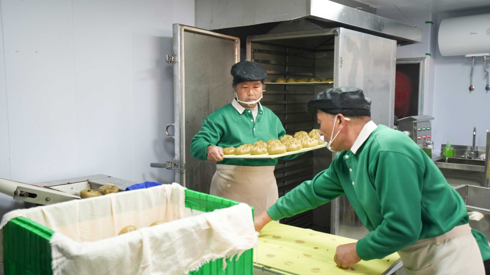 开业当天,现场热度持续攀升。门外红幅高挂、花篮簇拥、锣鼓喧腾,喜庆氛围扑面而来;店内蒸汽氤氲、香气四溢,一盘盘食叶草馒头吸引市民驻足围观。