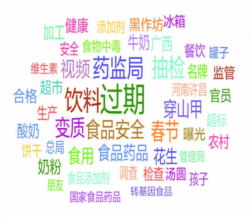 3.从词云图来看,“过期”“饮料”“变质”“汤圆”“穿山甲”等成为2017年春节期间的传播热点。