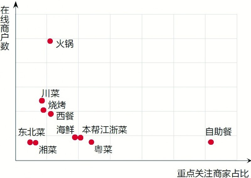 由图1可见,十大餐饮品类的重点关注商家占比中,自助餐、粤菜、海鲜、本帮江浙菜四个品类超过了平均值,应重点关注。