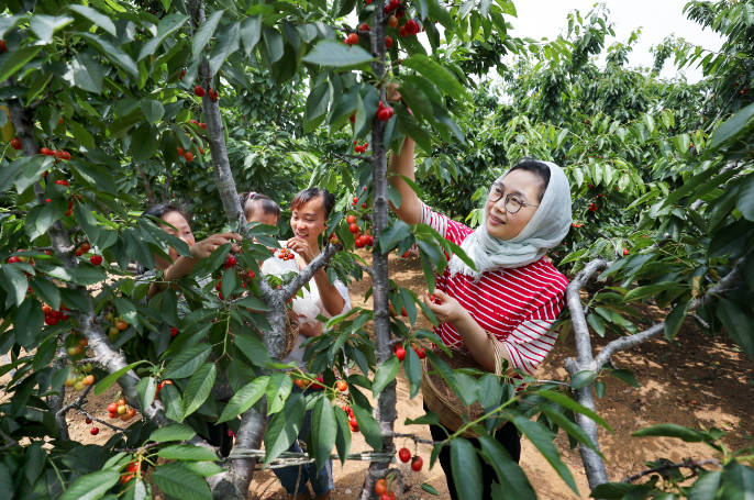 核心提示:5月29日,游客在江苏省连云港市赣榆区厉庄镇谢湖村采摘大樱桃。 近年来,江苏省连云港市赣榆区利用独特的生态环境优势和良好