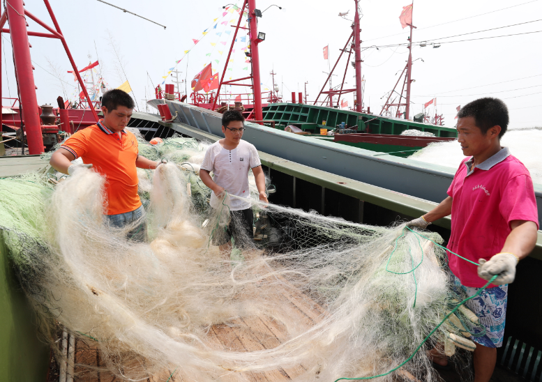 7月24日,在江苏省连云港市赣榆区青口港渔业码头,渔民在整理网具。