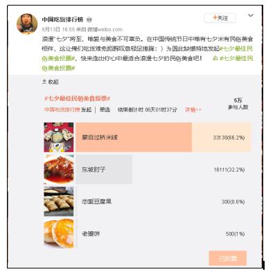 一场“七夕最佳民俗美食投票”竟然成为男性网友的吐槽大会和全国各地网友力挺家乡美食的PK赛,侧面反映了当下在七夕节变得越来越商业化、空洞化、物质化的情况下,人们急需一种走心又美味的浪漫美食来满足心灵层面的需求。在中国传统节日中唯有七夕没有民俗美食相伴,从鹊桥到过桥,七夕节的文化内涵得到进一步深化和丰富,或许在亲民的“蒙自过桥米线”加持下,情侣们能够不为爱情所累,更好滴享受一场纯粹的、平淡却美好浪漫的七夕节。