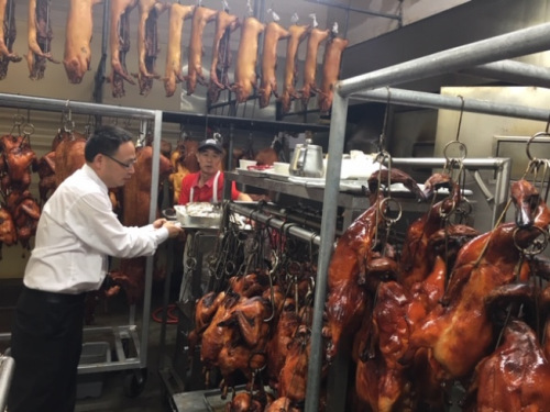 许多华人家庭预定火鸡过节,商家大厨们一夜没睡辛苦准备。(美国《世界日报》/杨青 摄)