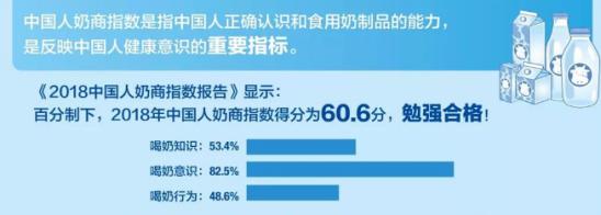 近年来,随着生活水平的不断提高,越来越多的中国人也开始注重乳制品的摄入,有意识地将牛奶加入到日常膳食中。据《2018年中国人奶商指数报告》结果显示4,2018 年,中国人奶商指数得分仅为 60.6 分,勉强合格,指标总体水平不高,但决定奶商指数的三个维度中,喝奶意识得分却达到了 82.5 分,处于良好水平,但喝奶知识(53.4 分)和喝奶行为得分(48.6 分)双双不及格。