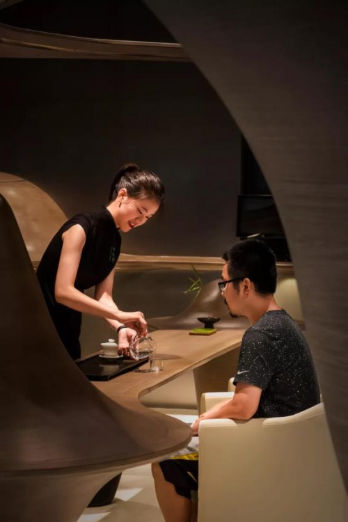 有趣的是金属材质的“云山”里,还巧妙地融入了音响和香薰系统,置身其中,听茶曲,闻茶香,观茶形,感茶温,品茶味,用五感沉浸式地享受一杯竹叶青。弧形的金属线条,则将空间割裂出“私人区”与“开放区”,你可以和老友、亲人在这里亲密相聚,也可以在开放品饮区里结交更多的新朋友。普世浊流中,吐故、纳新、修身。