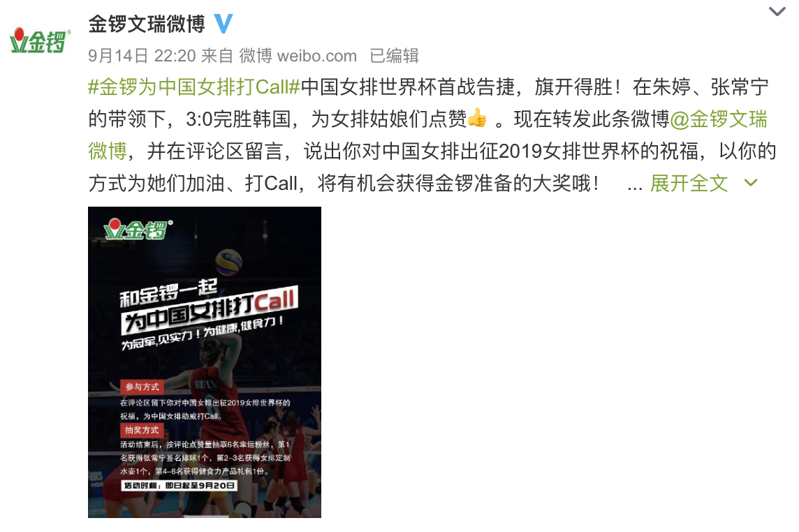 作为中国女排赞助商“金锣”也在第一时间为中国女排送上祝福,并在金锣文瑞官方微博发起了为女排打Call活动,转发活动微博并留言为女排加油助威,便有机会获得中国女排明星队员张常宁的签名排球和金锣健食力礼包等大奖。