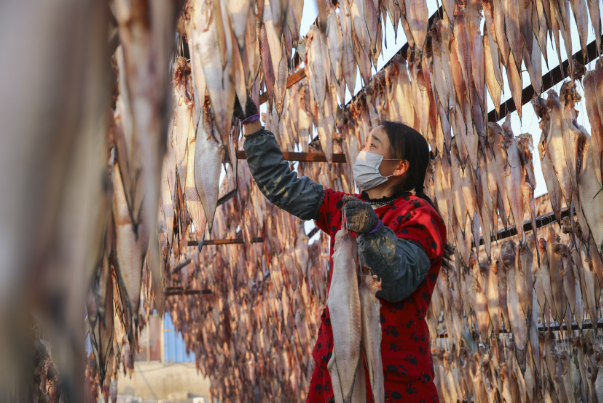 初冬时节,天气晴好,江苏连云港市沿海渔民忙着将捕获的鱼类晾晒成鱼干供应市场,渔村处处呈现一派繁忙景象。