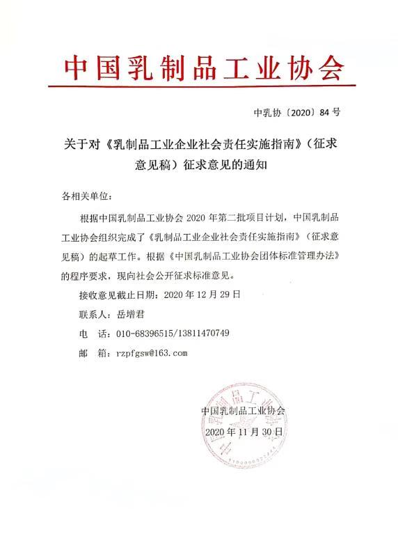 中国乳制品工业协会关于对《乳制品工业企业社会责任实施指南》(征求意见稿)征求意见的通知 (中乳协〔2020〕84号)