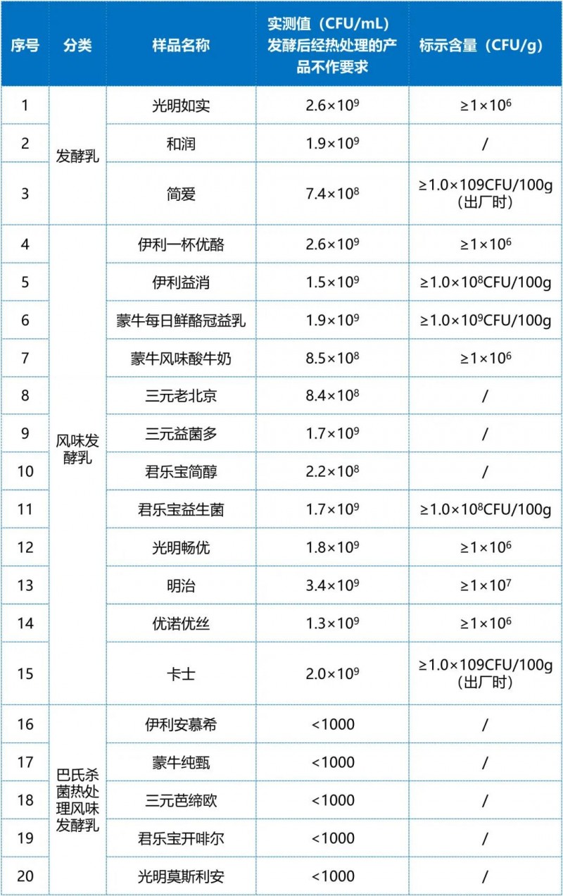 经测试,15种发酵乳、风味发酵乳样品,其乳酸菌总数均达到标准要求的不低于106CFU/g(mL)的限量要求,符合各产品标签中声称的乳酸菌数量。