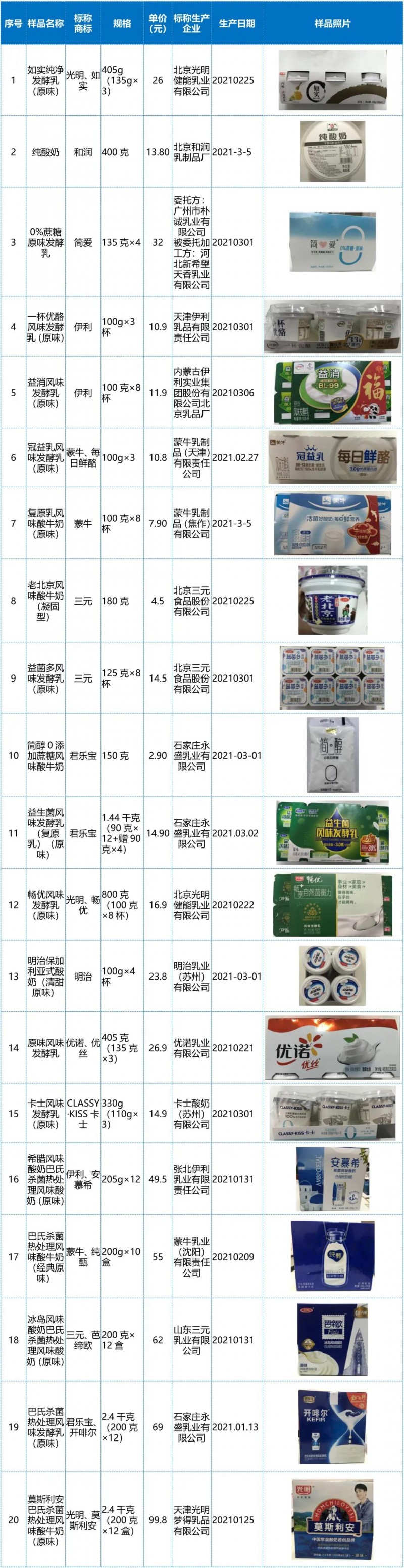 比较试验的样品,由北京市消费者协会工作人员以普通消费者身份,从北京市7家超市购买,样品涉及伊利、蒙牛、三元、光明、君乐宝、和润、明治、简爱、卡士和优诺10个品牌的20种酸奶样品。其中既有国内传统大型乳企和新兴乳企,还包括了国外酸奶品牌。本次试验依据相关标准进行测试。比较试验结果仅对购买的样品负责。