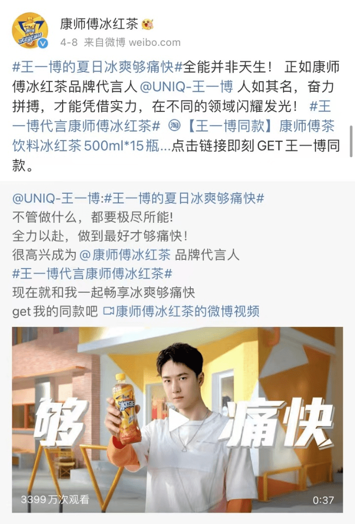 这么一看,王一博与代言康师傅冰红茶的合作浑然天成。这种高契合度的代言,才能赢得粉丝认同,更易在消费者心中建立品牌联想。此时,代言人的人格魅力,也更能在后续传播中,有助于品牌形象和理念渗透到更广泛的用户群体中。