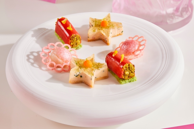 「五芒星」 「奇门走廊」 「缪斯之饮」等七味珍品与鸡尾酒「猎户座」,构成了这一粉红世界的完整景观。各异食材依其特性被赋予缤纷造型,有如冰环围绕的神秘星球,或如蜜桃铺就的拱形长廊,更有状如草莓,却暗有乾坤的奇趣幻象。鸭肝、龙虾冻、三文鱼糕等经典法餐元素,经 Jérôme 独创的处理手法,风味呈现出异世界的奇妙;白芦笋、柑橘与丰富的夏日花草,则为下午茶增添当季风情。